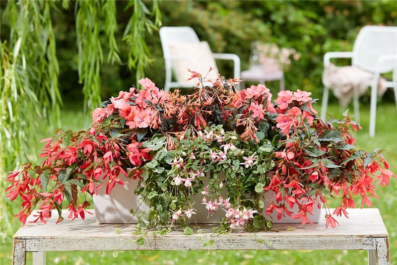 In diesem Kasten tummeln sich im Hintergrund das blütenreiche und ausdauernde Edellieschen (Impatiens neuguinea-Hybride) und die hübsche Korallenfuchsie (Fuchsia-Hybride). Die langen kelchförmigen Blüten der Korallenfuchsie unterscheiden sich von den Glockenblüten der Fuchsie (Fuchsia-Hybride). Verstärkung bekommt dieses Blumenkasten-Arrangement von der buschig wachsenden Hänge-Begonie (Begonia iconia 'Summerwings' / Begonia tuber-Hybride). Die heimische Wildstaude Gundermann (Glechoma hederacea) rundet diesen Blumenkasten passend ab. Während ihrer Blüte-zeit von März bis Mai ist sie für Wildbienen eine wichtige Nahrungsquelle. Wer so viel blüht, muss auch regelmäßig gegossen werden, das gilt auch für die Pflanzen an einem schattigen Platz.