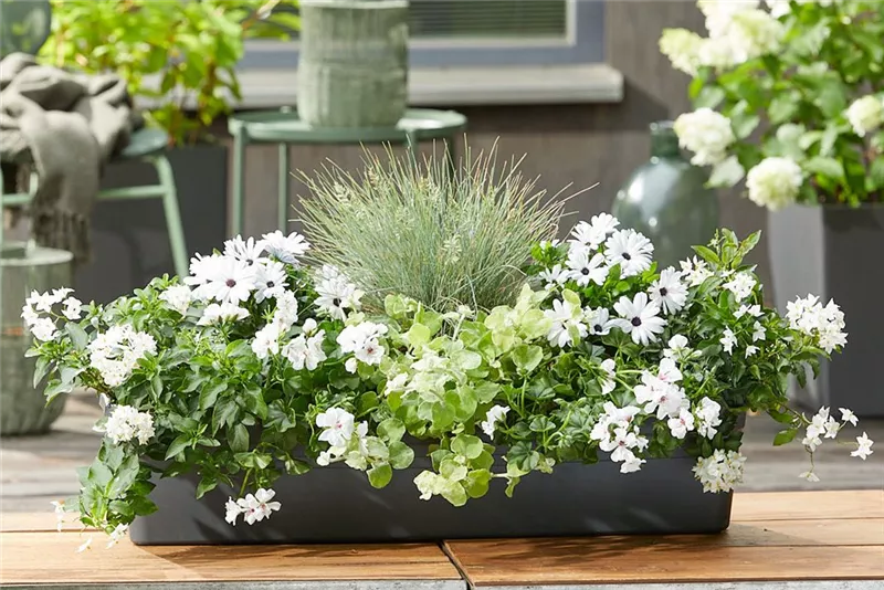 Die spitzen Halme des Blauschwingels (Festuca glauca) wirken frech, wenn Sie ihn in der Mitte des Balkonkastens platzieren. Einen schönen Kontrast zu diesem pflegeleichten Gras bilden die weißen strahlenden Blüten des Kapkörbchens (Osteospermum) und der Geranie (Pelargonium peltatum 'Ville de Paris'). Jasmin (Solanum jasminoides) pflanzen Sie am besten an den äußeren Seiten des Balkonkastens. Die überhängenden Blütentriebe dieser Kletterpflanze kommen an dieser Stelle besonders ausdrucksvoll zur Geltung. Auch wenn seine herrlichen Blüten nicht duften, so zieht seine Blütenpracht bis zum Frost viele Bienen, Hummeln und Falter an. Eine weitere Strukturpflanze mit hängendem Wuchs ist Silberregen (Dichondra argentea). Er passt mit seinen silbrig-grünen Blättern perfekt zu "Modern Greenery". Gießen Sie diesen sonnenhungrigen Balkonkasten regelmäßig, vermeiden Sie aber Staunässe.