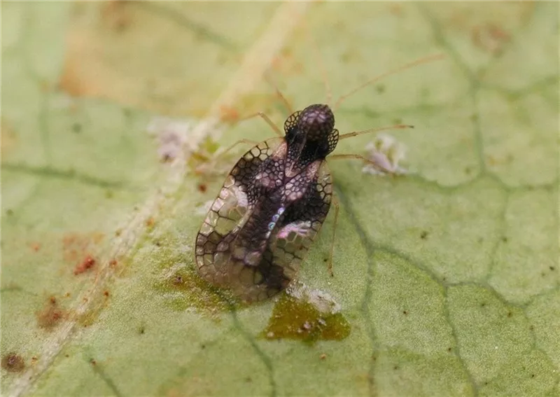 Die Andromeda Netzwanze (Stephanitis takeyai) saugt ab Mai an den Blättern der Lavendelheide. Die Tier bilden eine Generation pro Jahr. Die Eier werden im August in die Blätter gelegt.