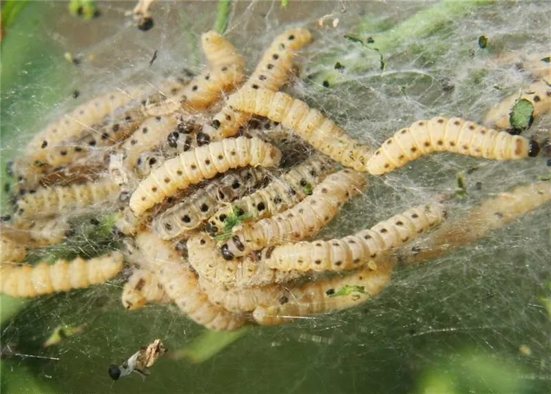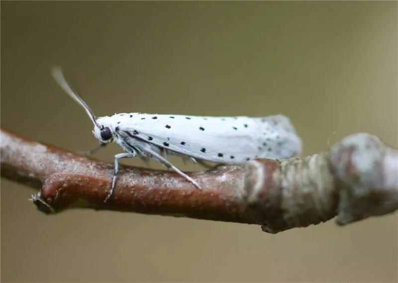 Die Apfelbaumgespinstmotte (Yponomeuta malinella) ist ein kleiner, heller Falter von ca. einem Zentimeter Länge. Die weißen Flügel sind auffällig schwarz gepunktet. Nach vollendeter Larvenentwicklung verpuppen sich die Tiere innerhalb des Gespinstes.