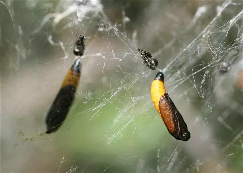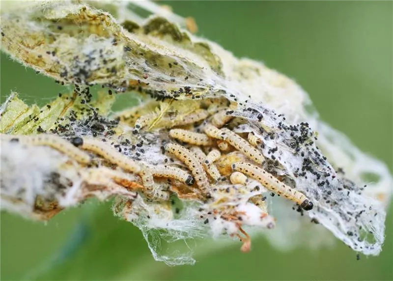 Außerdem sind die Gespinste mit schwarzen Kotkrümeln übersät. Die Tiere fressen junge Blätter, von denen sie nur die Blattrippen, die sie mit feinen Fäden zusammenspinnen, stehen lassen.