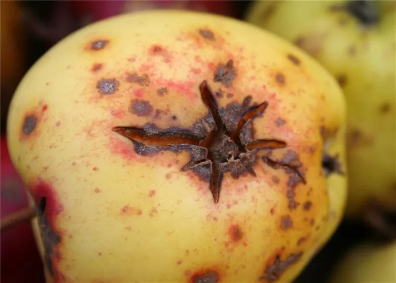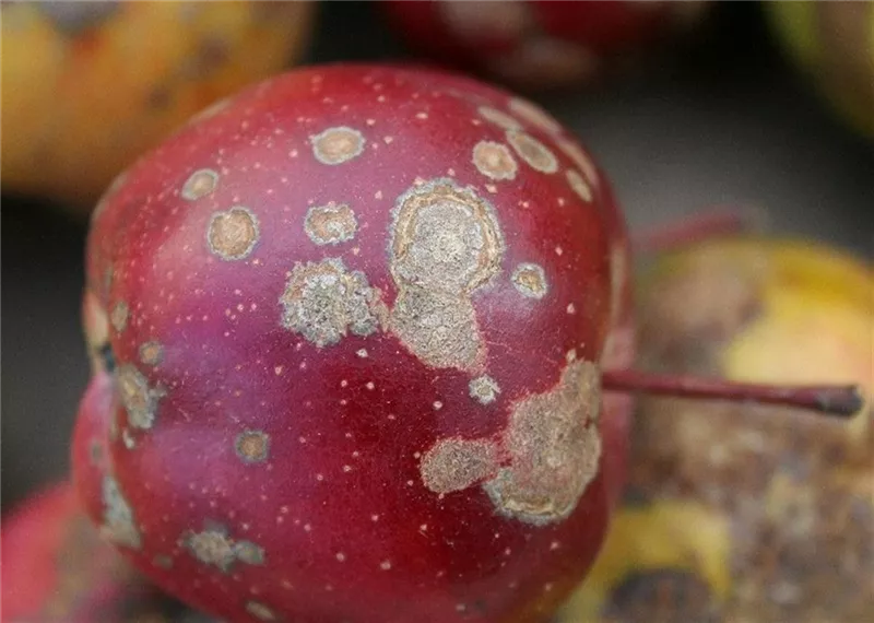 Auf den Früchten entstehen anfangs kleine, runde, dunkle Flecke, die sich später ausdehnen können. Bei starkem Befall reißt die Fruchtschale schorfig auf. Auf den Blättern bilden sich graubraune Flecken mit samtigem Aussehen. Ein ähnliches Schadbild verursacht die Rußfleckenkrankheit.