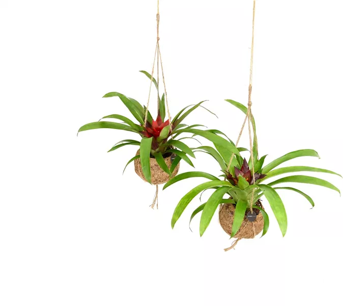 Der Kokodama Bromelie (Bromelia) eignet sich für einen hellen und warmen Standort, jedoch ohne direkte Sonneneinstrahlung. Bromelien sind südamerikanische Urwaldexoten, deren leuchtende Blüten mehrere Monate lang erstrahlen. Besprühen Sie die Bromelie leicht mit Wasser oder gießen Sie direkt in die Blattrosette.