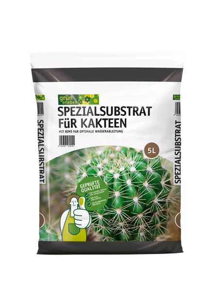 Grün erleben SPEZIALSUBSTRAT FüR KAKTEEN mit Bims für optimale Wasserableitung. Das Substrat ist für alle Arten von Kakteen, Bonsai und Sukkulenten geeignet.